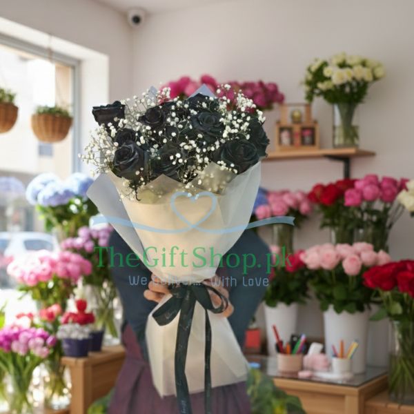 When you choose to send flowers to Pakistan, reliability is just as important as beauty. Redefine the art of gifting with Starlit Midnight, an avant-garde floral arrangement that captures the mystery of the night sky. This bouquet is designed for those who seek something beyond the traditional, blending deep, velvet-textured black spray roses with the delicate, sparkling contrast of white baby’s breath.